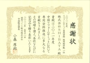 この度令和3年度、『関西ペイントリフォームサミット店専用塗料施工物件数』で中国地区第1位を獲得しました。