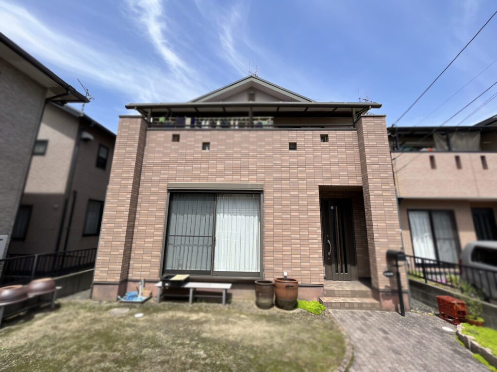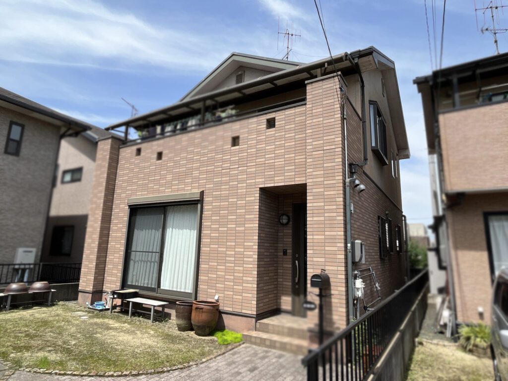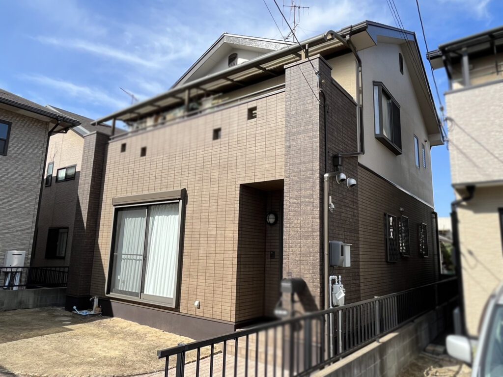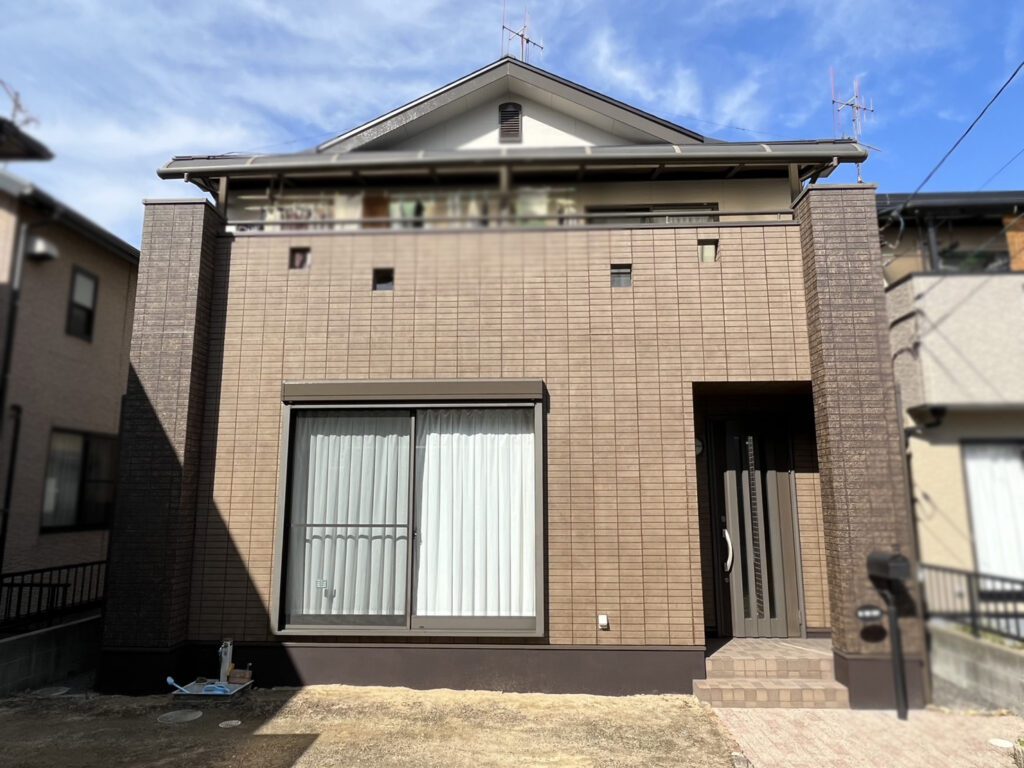屋根はガルバリウム鋼板のカバー工法にて施工。柱部分と1階部分をグラデーション塗装にて施工。重厚感のあるお家に変貌しました。