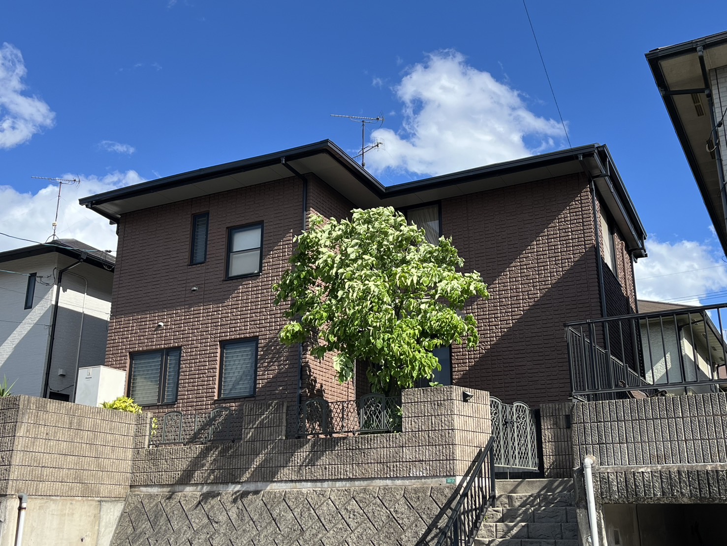 屋根のコケ、外壁目地のコーキングの亀裂が酷く発生している状態でした。